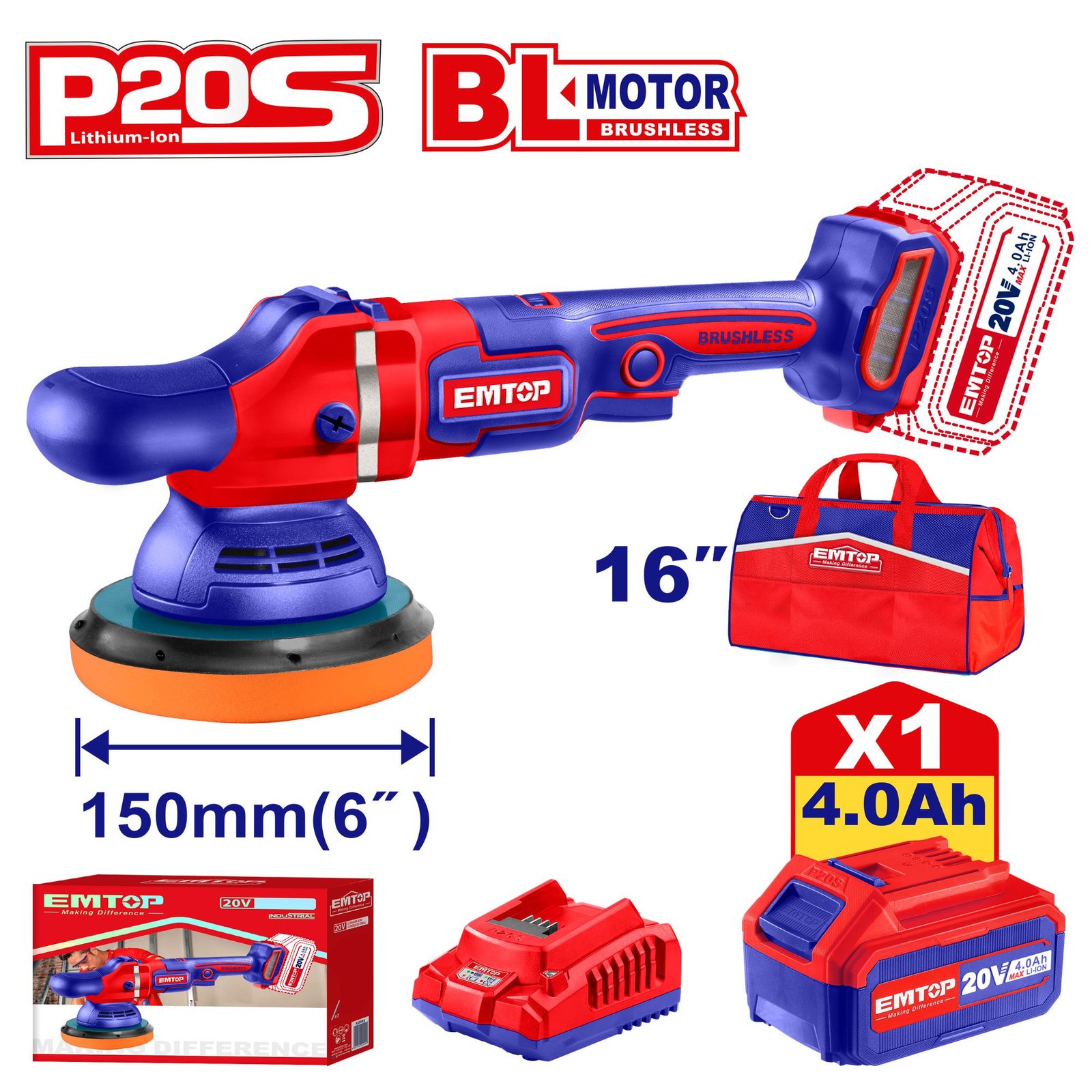 Батериска полирка ELAP20151 Emtop погонувана од BL мотор без четкици. Има работен дијаметар од 150 mm, варијабилна контрола на работна брзина и е спакувана во 16 инчна торба.